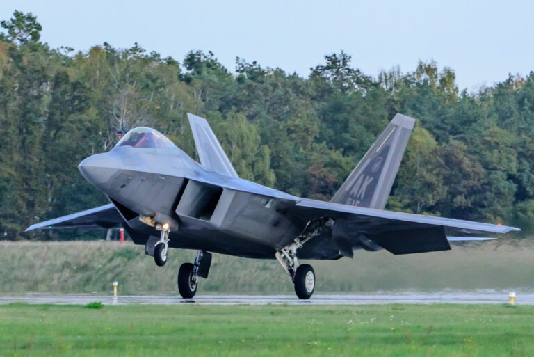 The slightly patched surface of the F-22 reflects in numerous colours under the brightly shining Polish sun, as two Raptors taxi to the runway. A new Air Shielding mission is about to be launched. These state of the art 5th generation fighters are part of the 90th Expeditionary Fighter Squadron. They have been deployed to Europe to show NATO’s teeth. Twan van Dommelen and Ben Gorski visited Łask Airbase to see and hear how this squadron complements the NATO Air Shielding mission.